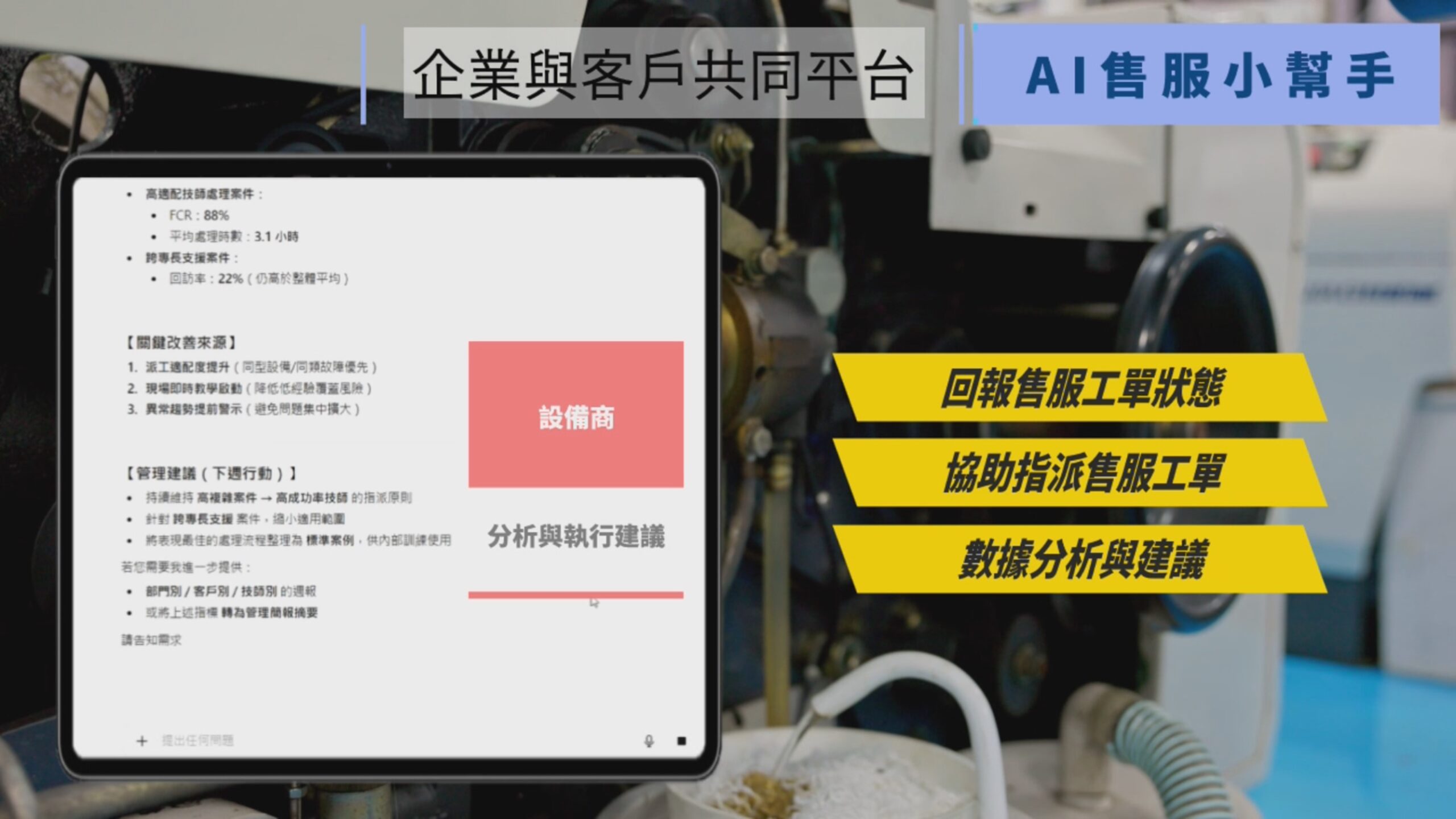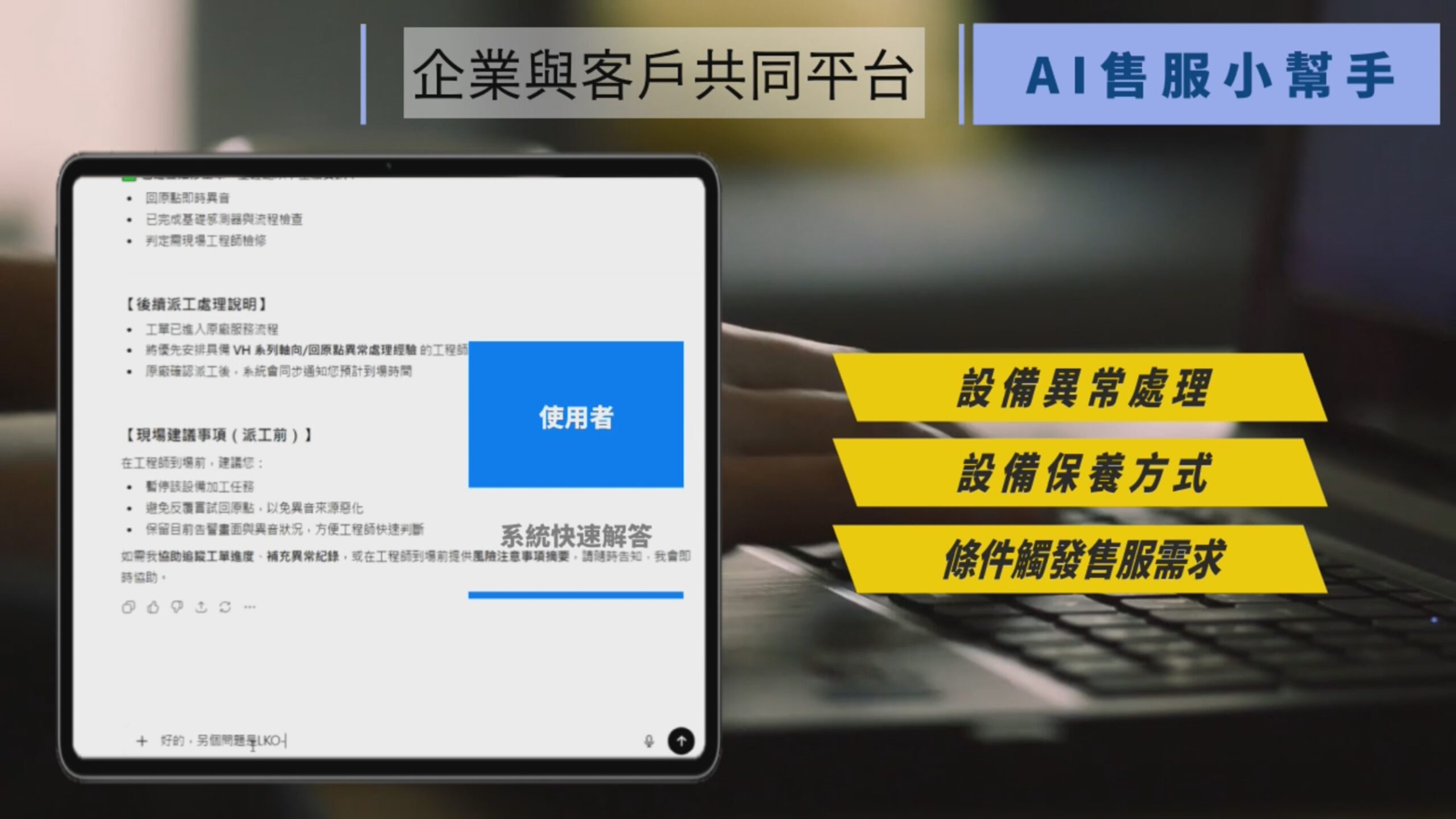 AI售服小幫手是設備商與客戶共同使用的平台,設備商可詢問售服工單狀態及提供維修數據分析。 客戶則能利用平台詢問異常機台簡易排除方式,若機台仍持續異常則會轉成專人服務,使維修溝通成本降低很多。