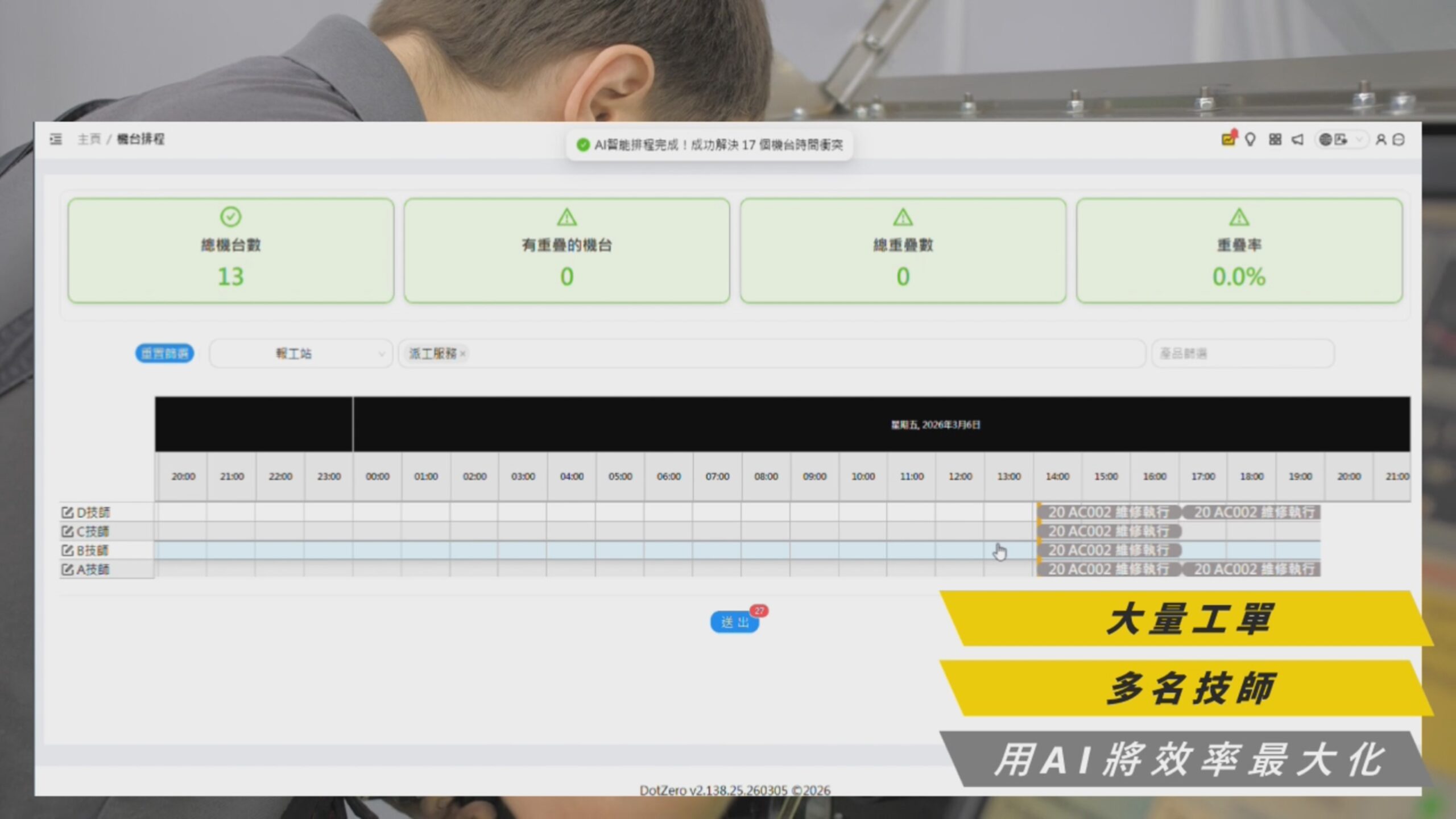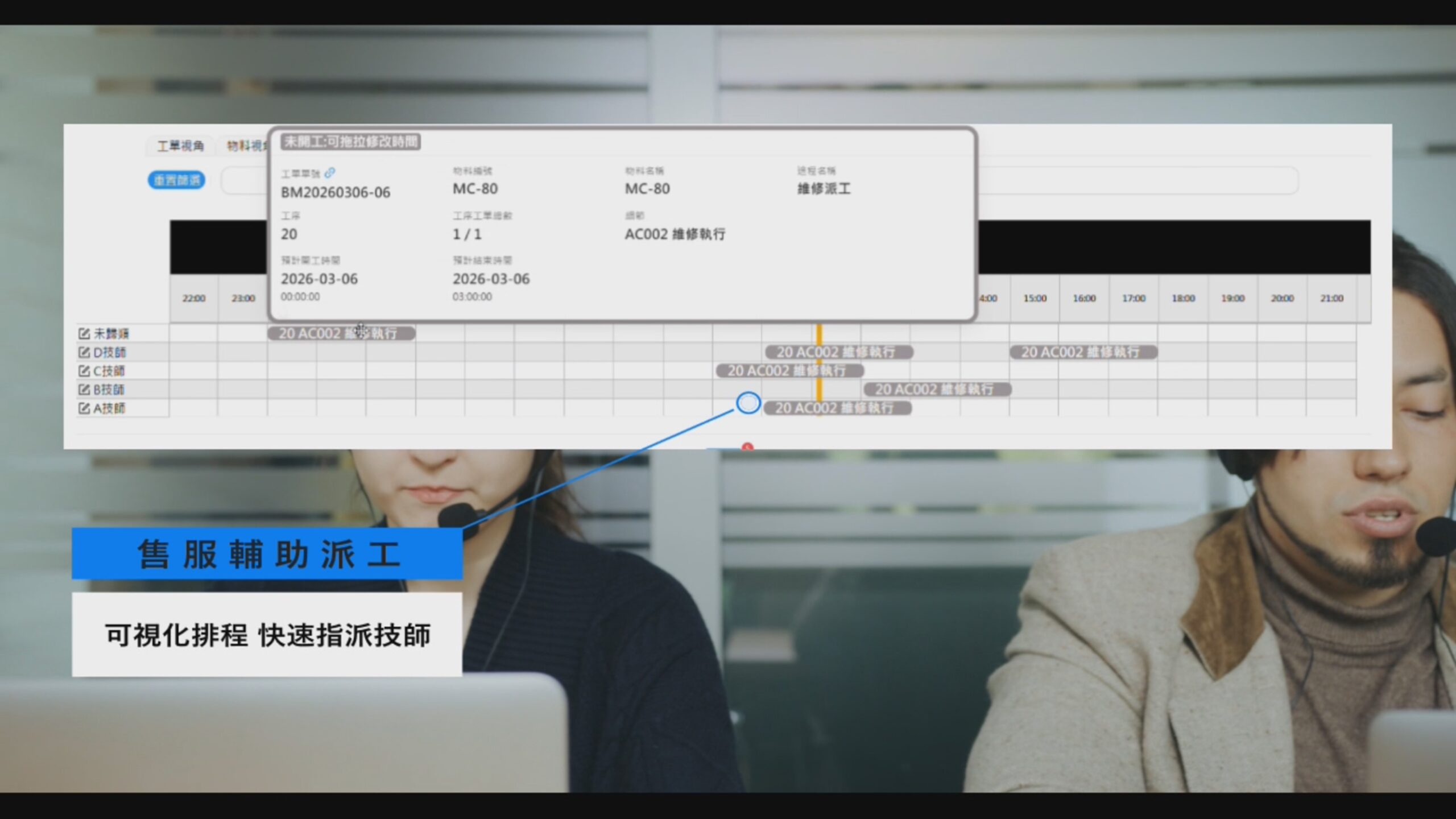 透過輔助派工系統將可快速查閱各技師的服務狀況,利用甘特圖即可拖拉不同技師的案件安排。