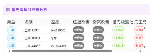 若遇客戶急單、插單或重要優先客戶,可以特別設定部分工單為優先安排工單,並期工改善分析結果參考。