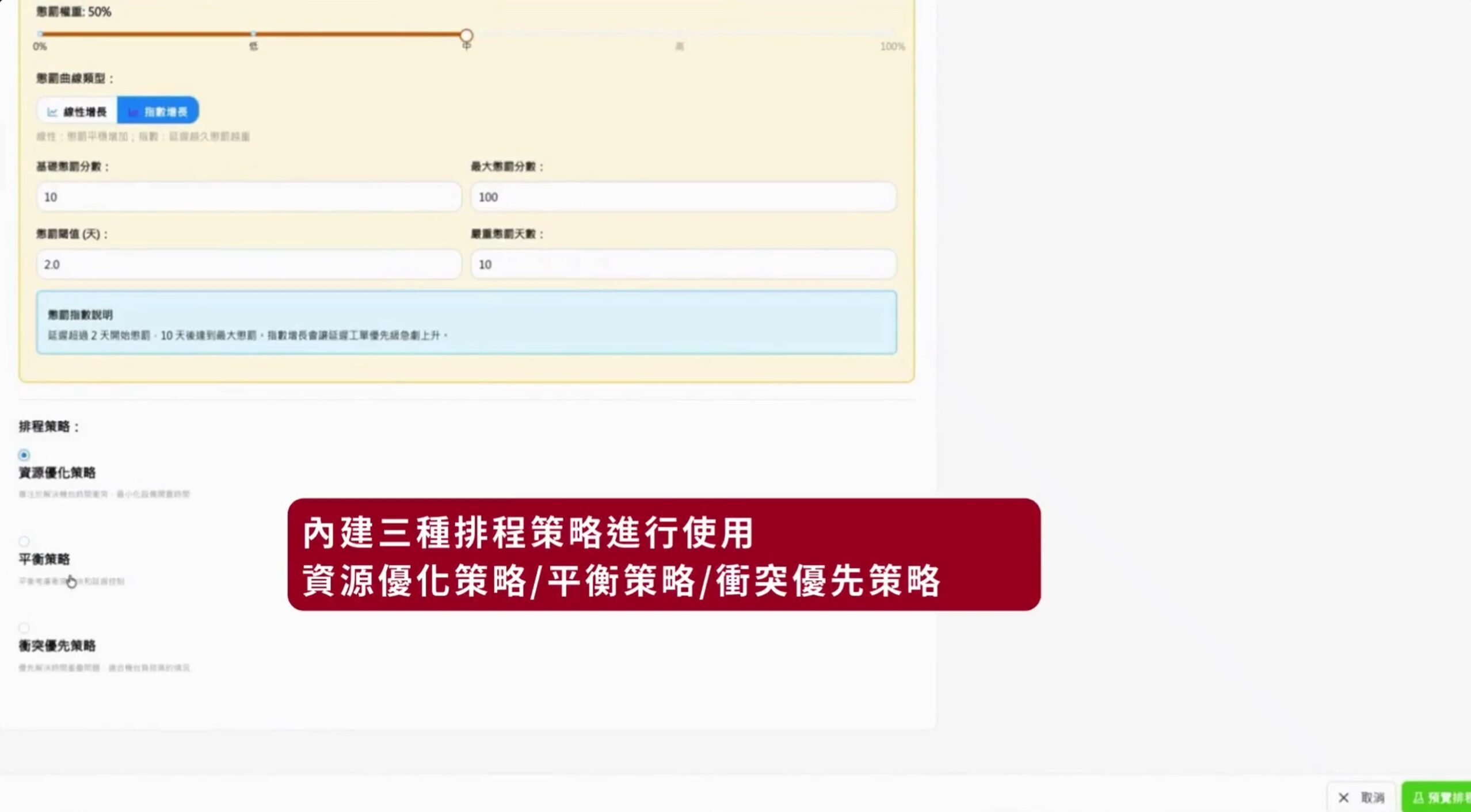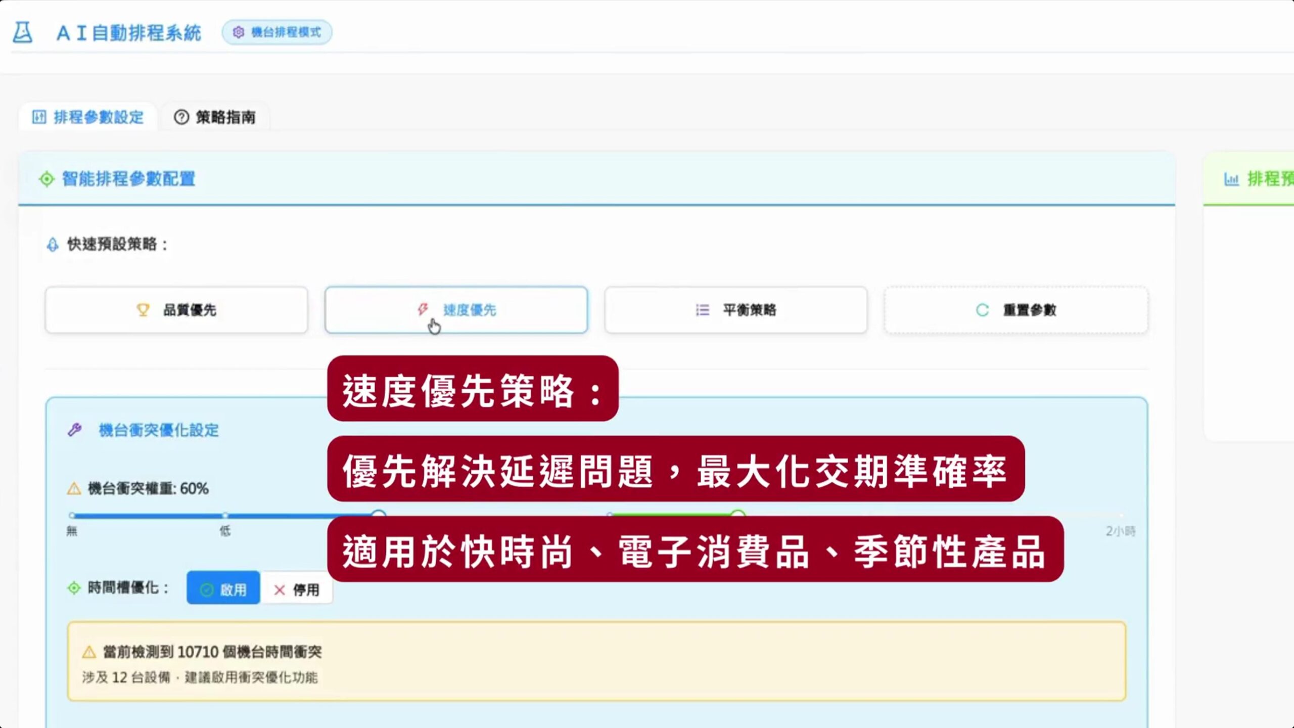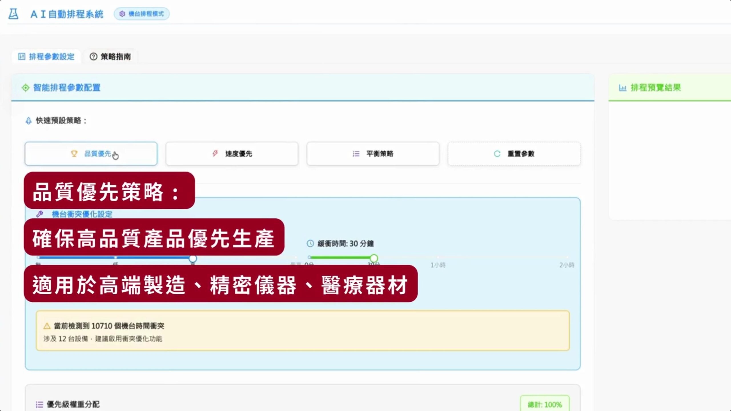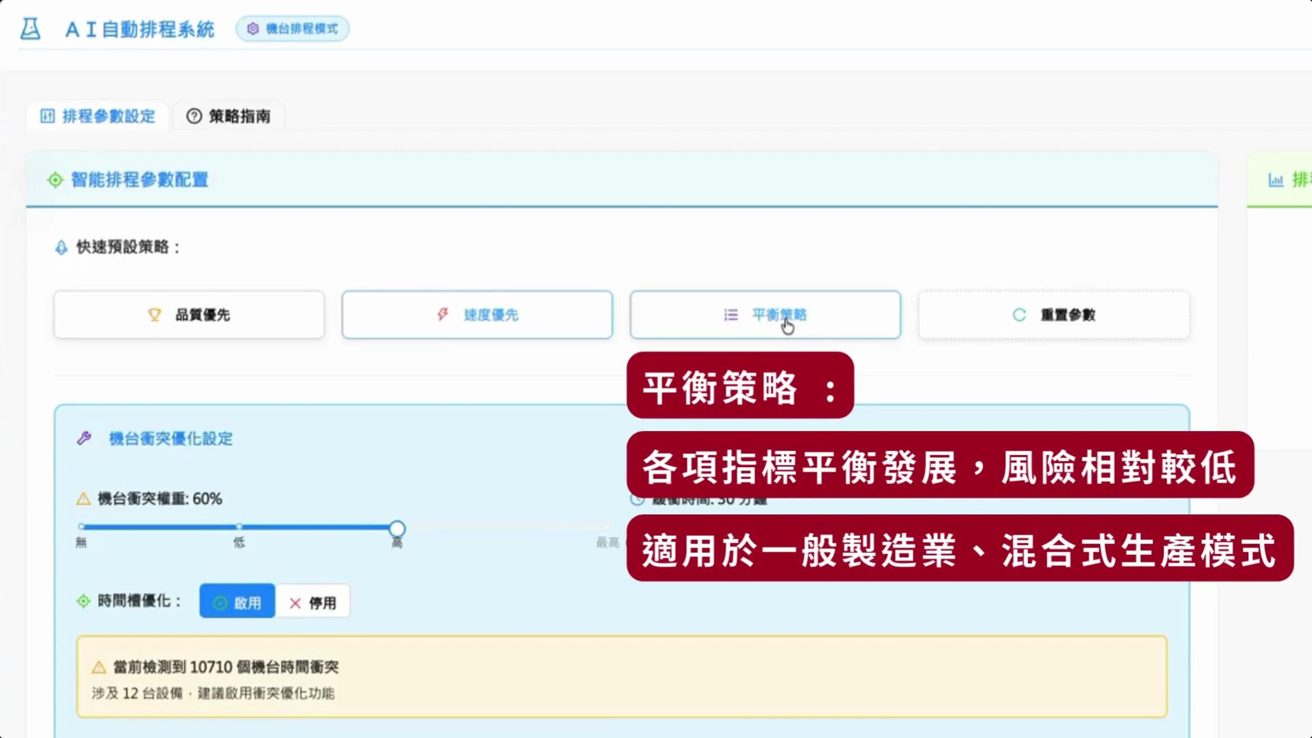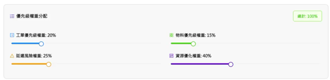 智慧排程系統提供四種權重參數進行計算,並提供預測的三種權重組合:品質優先策略、速度優先策略、平衡策略進行排程參數設定。