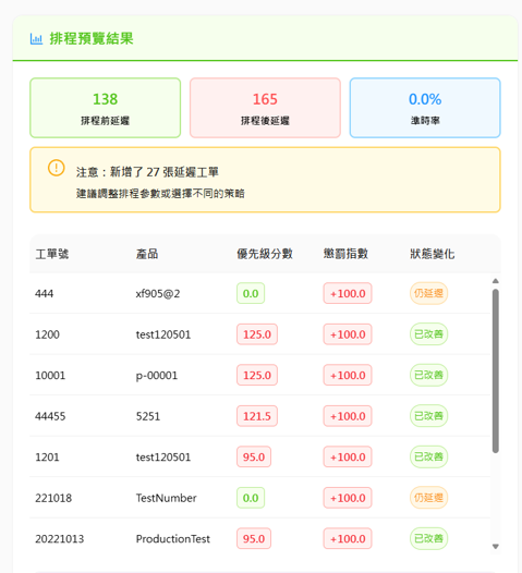 排程演算完畢後將提供排程結果總覽進行參考,確保所有單號符合預期的排程方式,亦可進行微調。